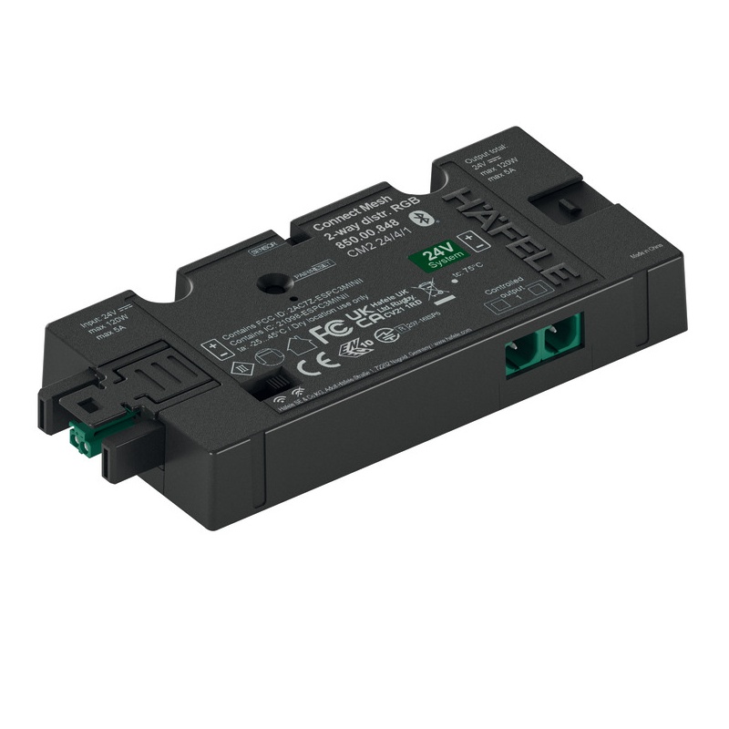 Häfele Connect Mesh jaoturil on 2 väljundit (ühenduspesa) värviliste LED valgustite ühendamiseks, väljundid on ühendatud üheks kanaliks, ning töötavad korraga.