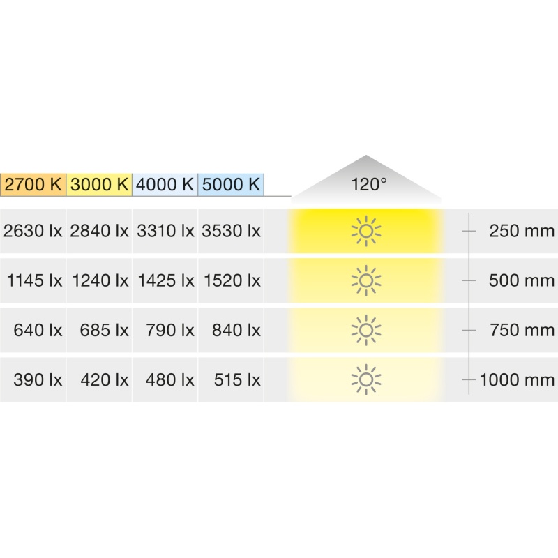 | Kelvin (K) | Vatt (W) | LED tk/m | Lumen | Lumen/Vatt | CRI Ra | NRG |