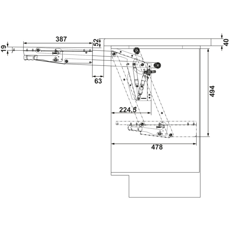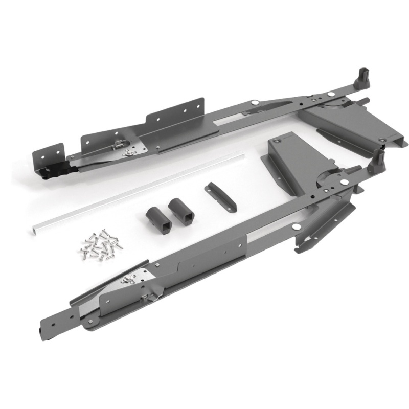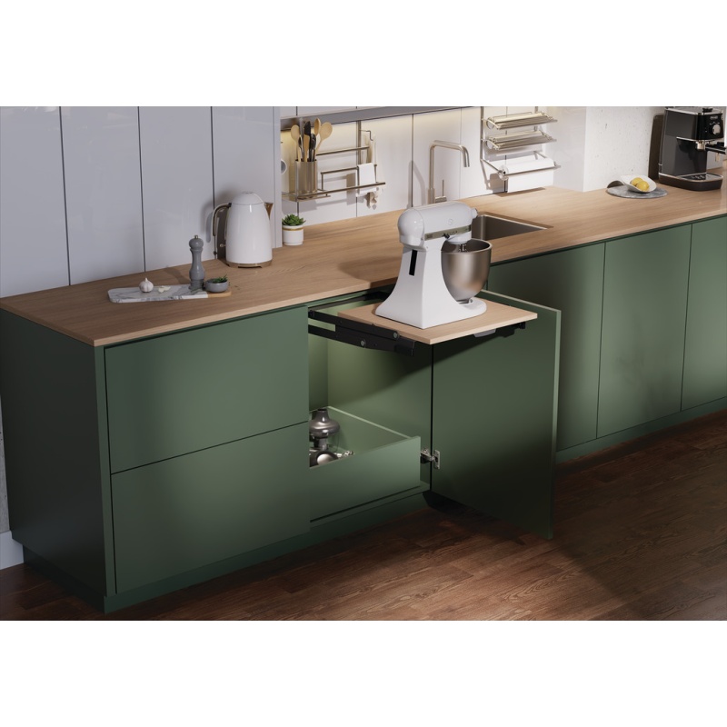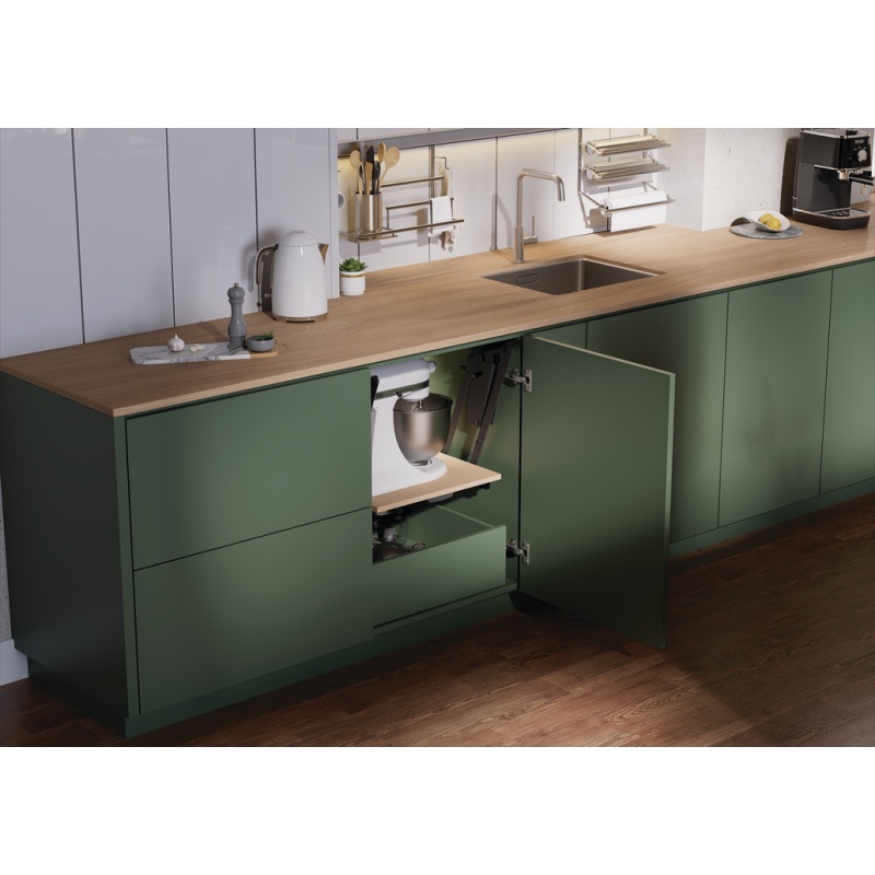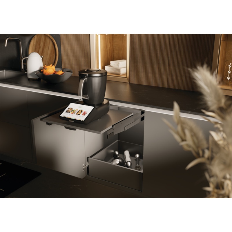 Lahendus hoiab tööpinna vabana, teeb seadme kättesaadavaks ühe liigutusega ning sobib paigalduseks hingedega ukse taha. Mehhanismil on integreeritud pehme sulgumine ehk (soft close).