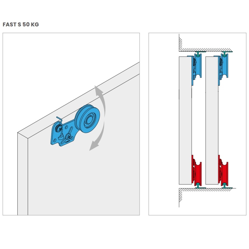 Lükandsüsteem FAST S, puitustele. Lihtne lükanduste furnituur, standard paigaldusega ei vaja furnituuri kinnitamiseks ukse töötlemist. Ülemine rullik on vedrustatud, kompenseerib kapi erinevate otste kõrguse erinevust.