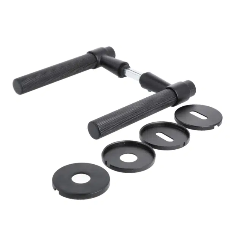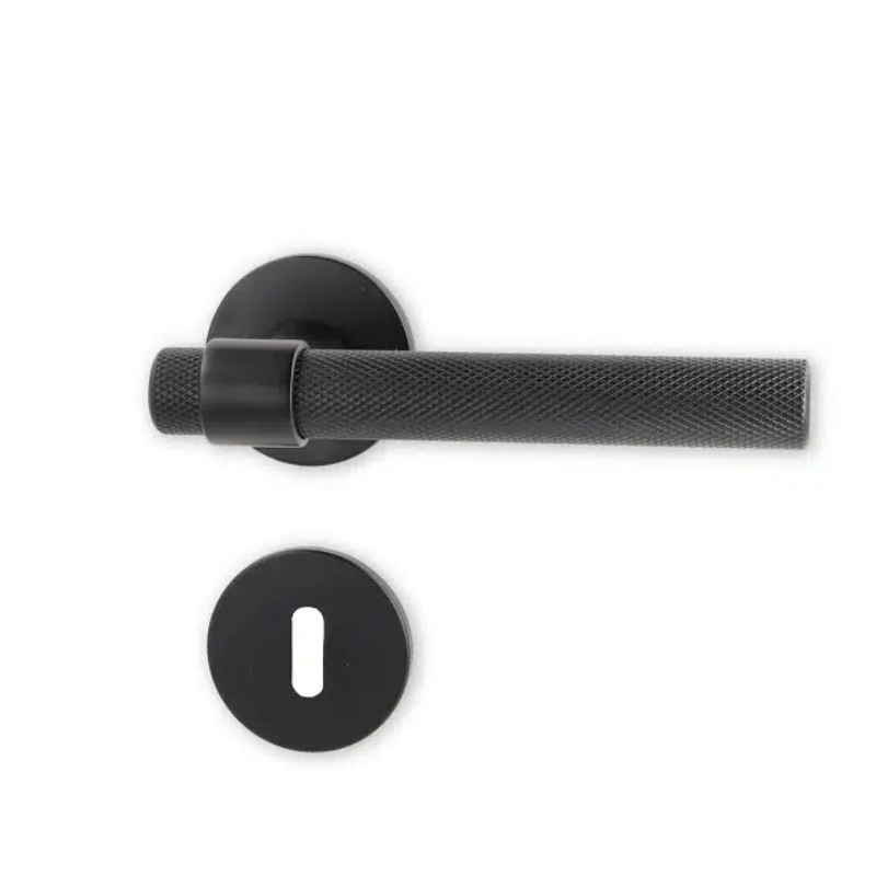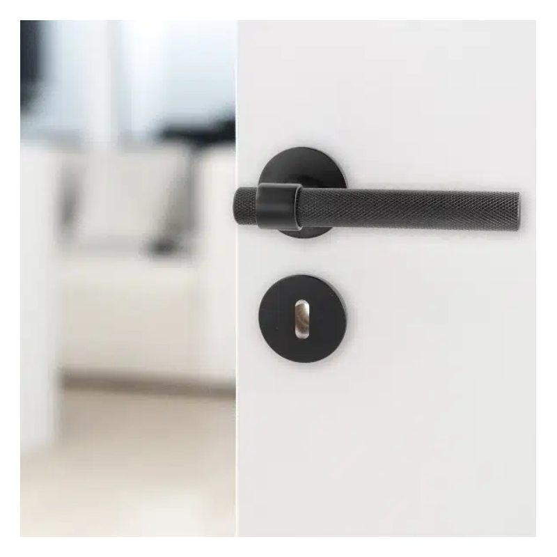 Modernse ja minimalistliku disainiga uksekäepide “House” mustas viimistluses. Komplekt sisaldab rosette, võtmeava katteid ning kõiki paigaldusvahendeid. Sobib 38–50 mm paksustele ustele.