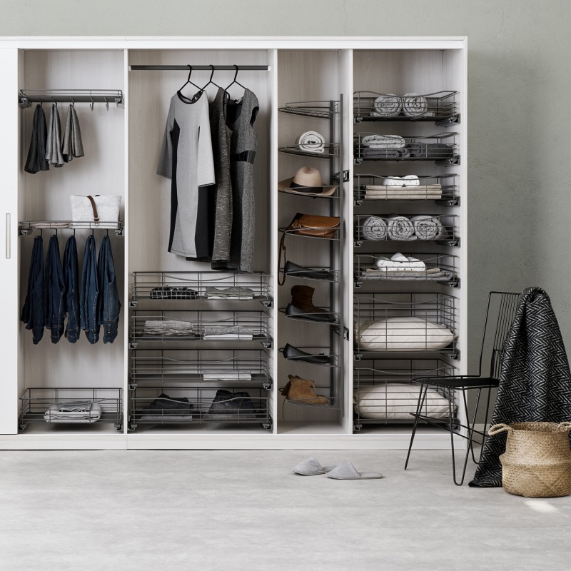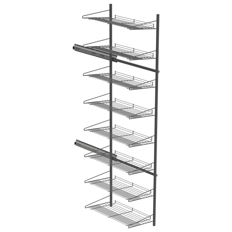 TOWER 8 - Praktiline väljatõmmatav jalanõude püstak kitsasse kappi, mis annab väikesele pinnale palju funktsionaalset panipaika. Ideaalne lahendus esikukappi — jalanõud, kotid ja peakatted on kenasti eraldi riiulitel ning tänu tihedale põhjavõrgule ei kuku esemed läbi ega libise riiulitelt maha.