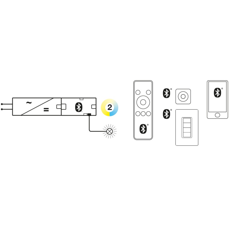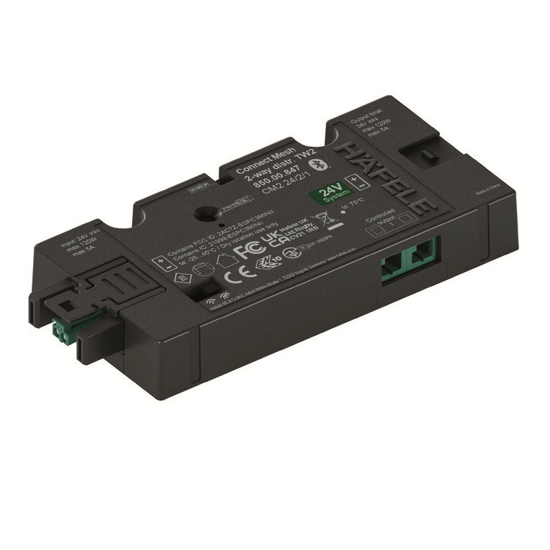 Блок управления Häfele Connect Mesh Bluetooth® предназначен для включения/выключения светодиодных светильников мультибелого света, регулировки яркости от 0 до 100% и изменения температуры белого света от 2700 до 5000 K.