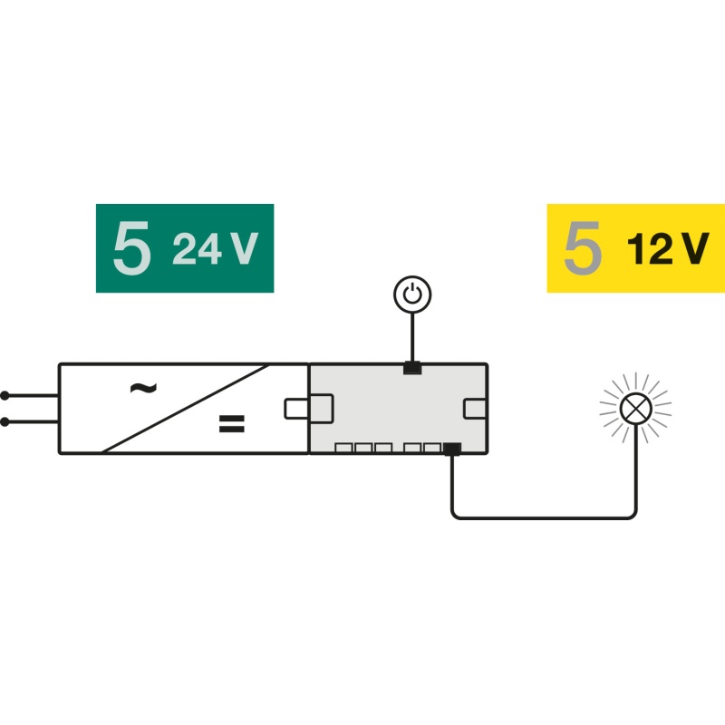 Конвертер служит для подключения 12 В светильников к 24 В блоку питания. Конвертер подключается к блоку питания (или еще одному распределительному устройству) с помощью штекерного соединения «коробка-коробка» (только блоки питания премиум) или с помощью удлинительного кабеля (премиум и ECO блоки питания).