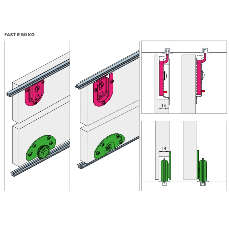 Раздвижная система FAST R для деревянных дверей. Простая фурнитура для раздвижных дверей, при стандартном монтаже, не требуется дополнительная обработка двери для установки фурнитуры.